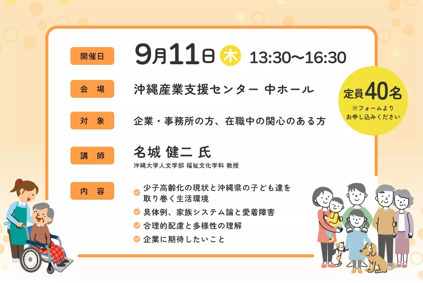 本講座では、専門家より、沖縄における子どもを取り巻く生活環境や介護の現状、そして、社会全体で沖縄を支えるために、企業が今、取り組むべき役割についてお話いただきます。