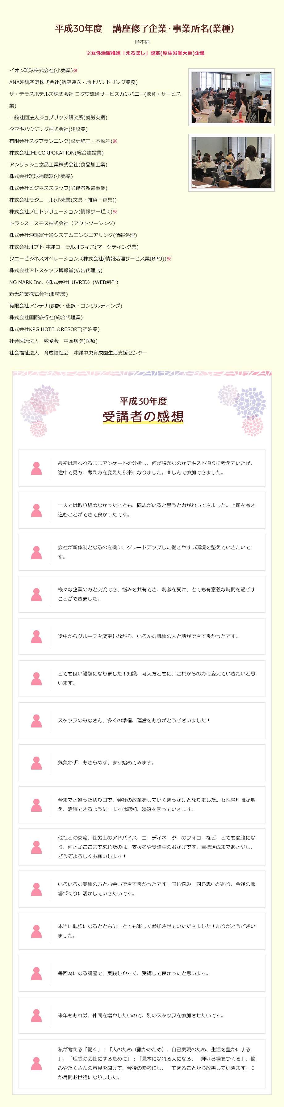 ・同じ受講生の玉城さんのお話から、具体的に「えるぼし」認定を受けるまでの取組みを聞くことができ、とても勉強になり、刺激を受けました。