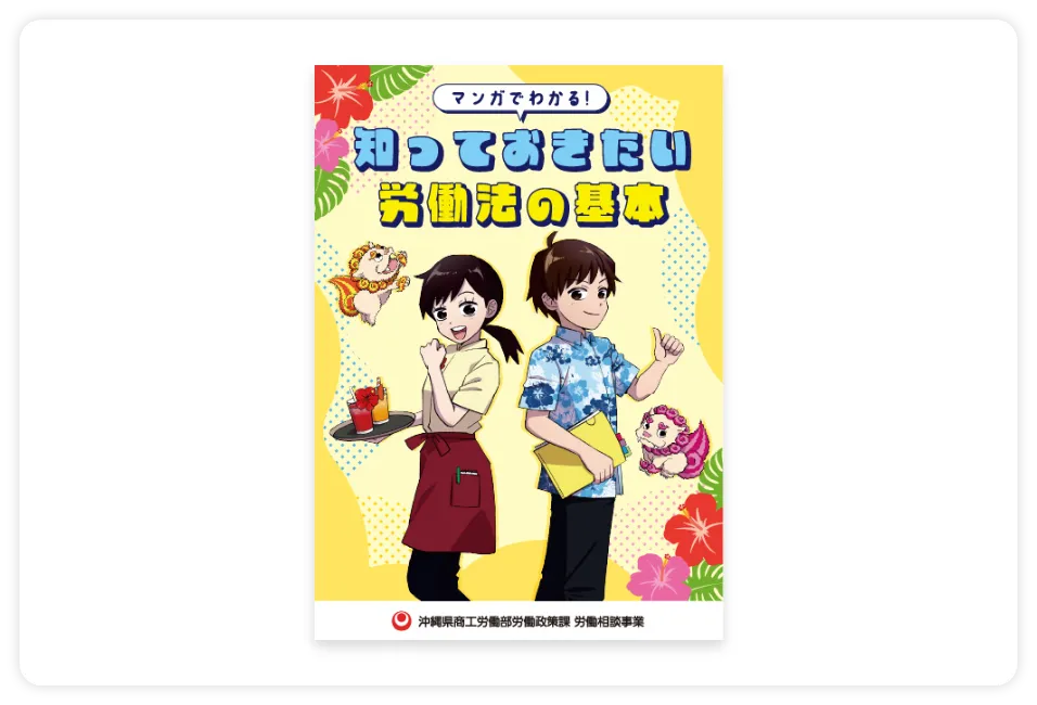 沖縄県の若者が労働の基礎知識を身につけることでトラブルを防ぎ、安心して働くことができるように労働法の基確知識を分かりやすく、マンガで学べるよう事例を交えながら、紹介しています。