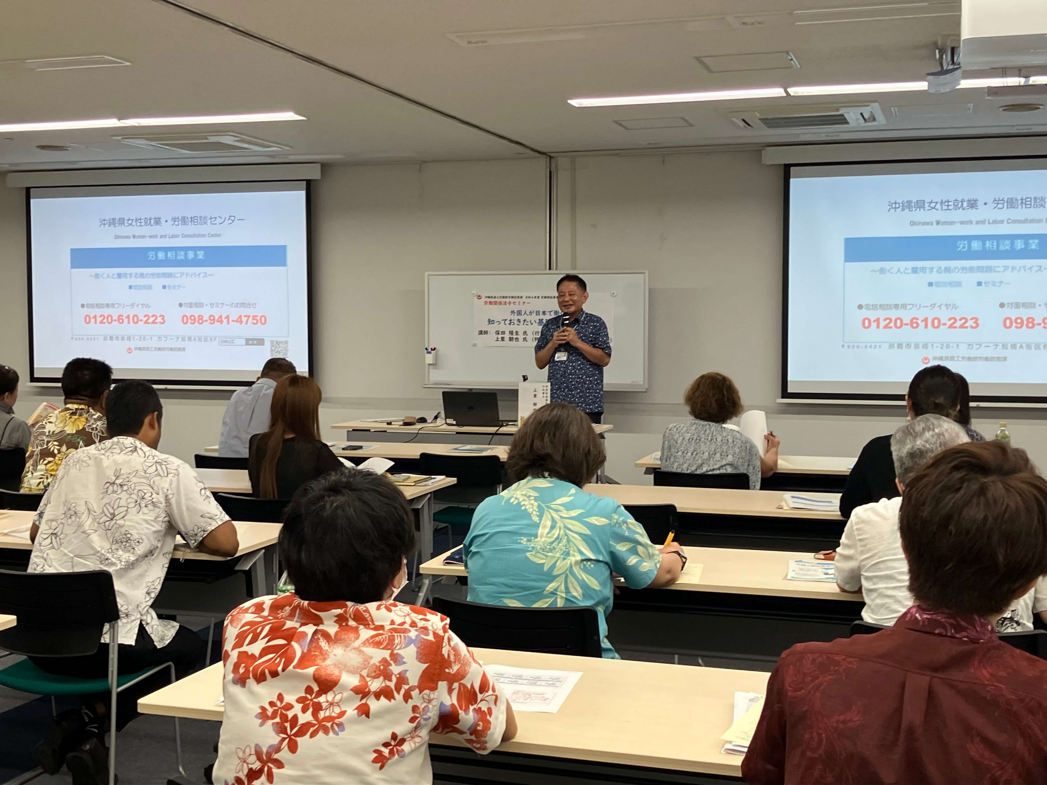 日本で働くときには外国人も日本の法律が適用される事から、前半は外国人が安心して日本で働くために必要な基本的知識について支援経験のある行政書士が事例を交えてお伝えし、後半は特定社会保険労務士が基本的な労働法についてポイントを押さえて説明を行いました。