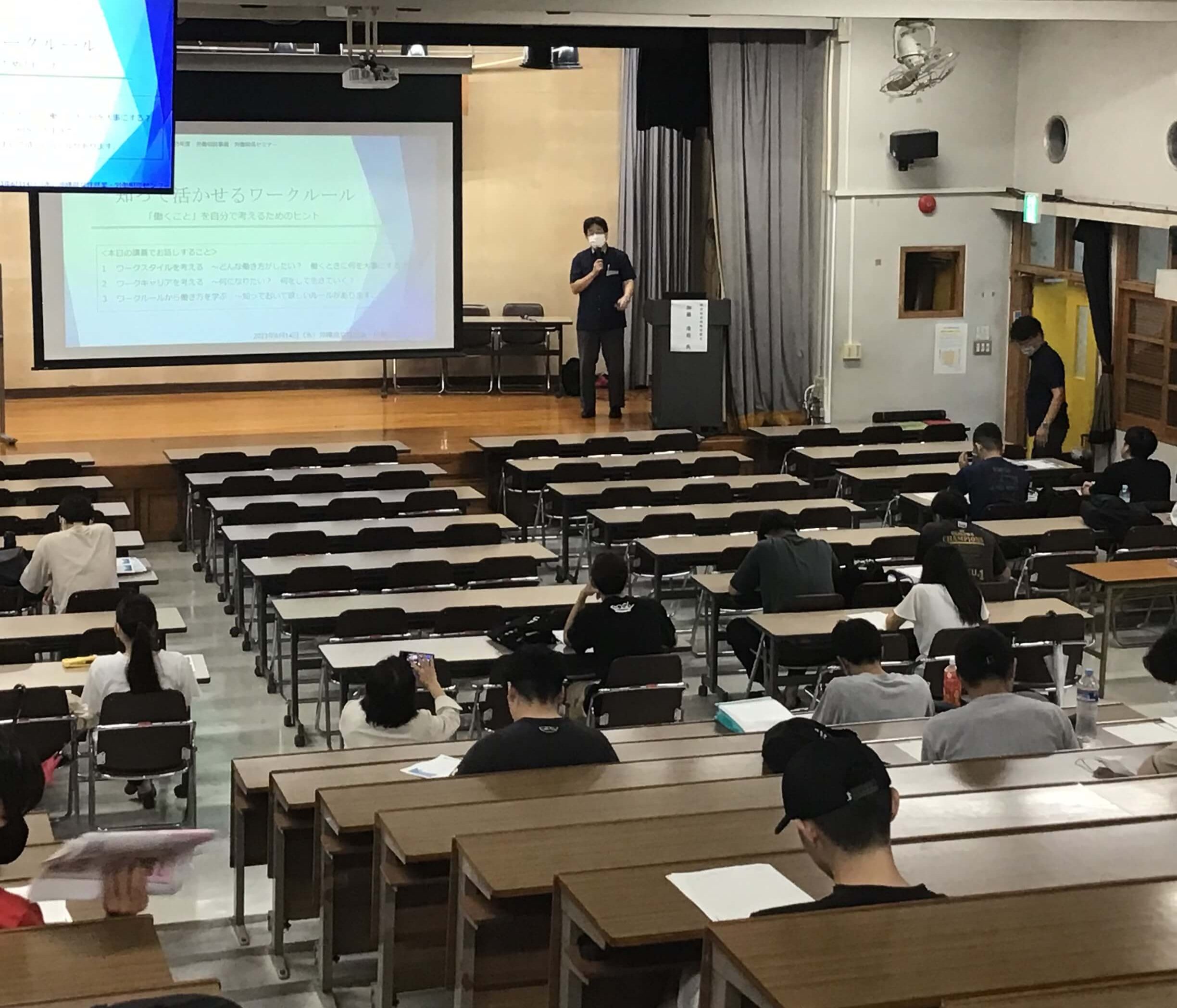 このセミナーは、学生向けに、アルバイトや就職後の労働関係法令や社会保障等に関する基礎知識を身につけてもらうため開催しました。講義形式にて労働関係法令や社会保障制度を学ぶ。社会に出る前に必要なことに加え、就職に活かせる内容を社会保険労務士が分かりやすく説明しました。