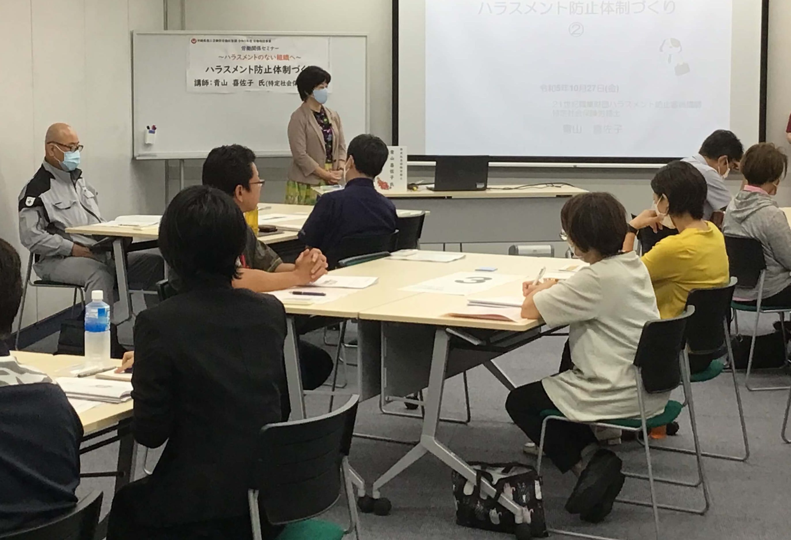 職場で起こり得るハラスメント問題に、ハラスメント対応への相談実績豊富な講師から、実際の事例も交えて必要な基礎知識を学びながら、ハラスメントに対する意識を高め、皆が安心して働ける職場づくりへとつなげるために開催されました。大変関心が高く、参加希望者が多かったために会場を変更しました。