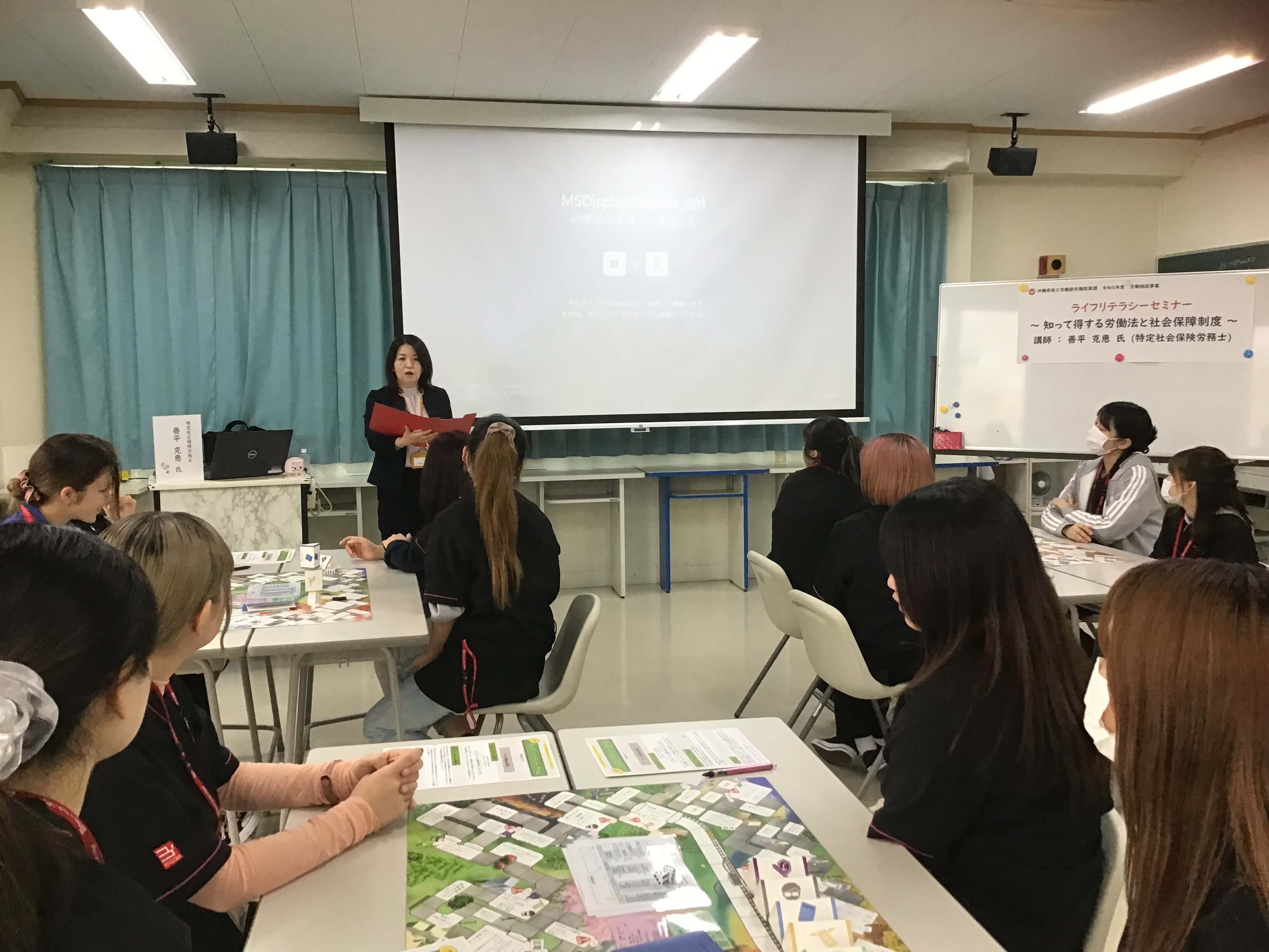 働くときに必要な知識やルールを、事例を交えて社会保険労務士が伝える。グループワークとしてのゲームを通じ、働く上でのもしもの時の社会保障や年金、納税の義務など社会参加の意義や大切さを伝えていく。